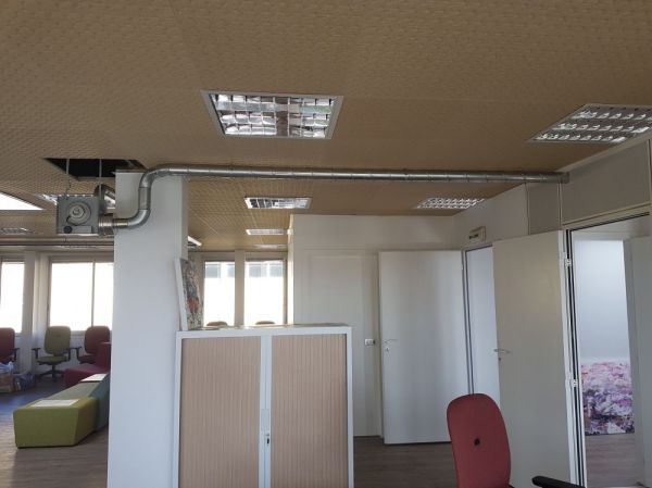 Installation de 2 poêles à granulés Artel CLASS 16kW pour traiter des volumes allant jusqu'à 400m3. Les gaines de canalisation permettent de transporter la chaleur dans des pièces/bureaux excentrés.